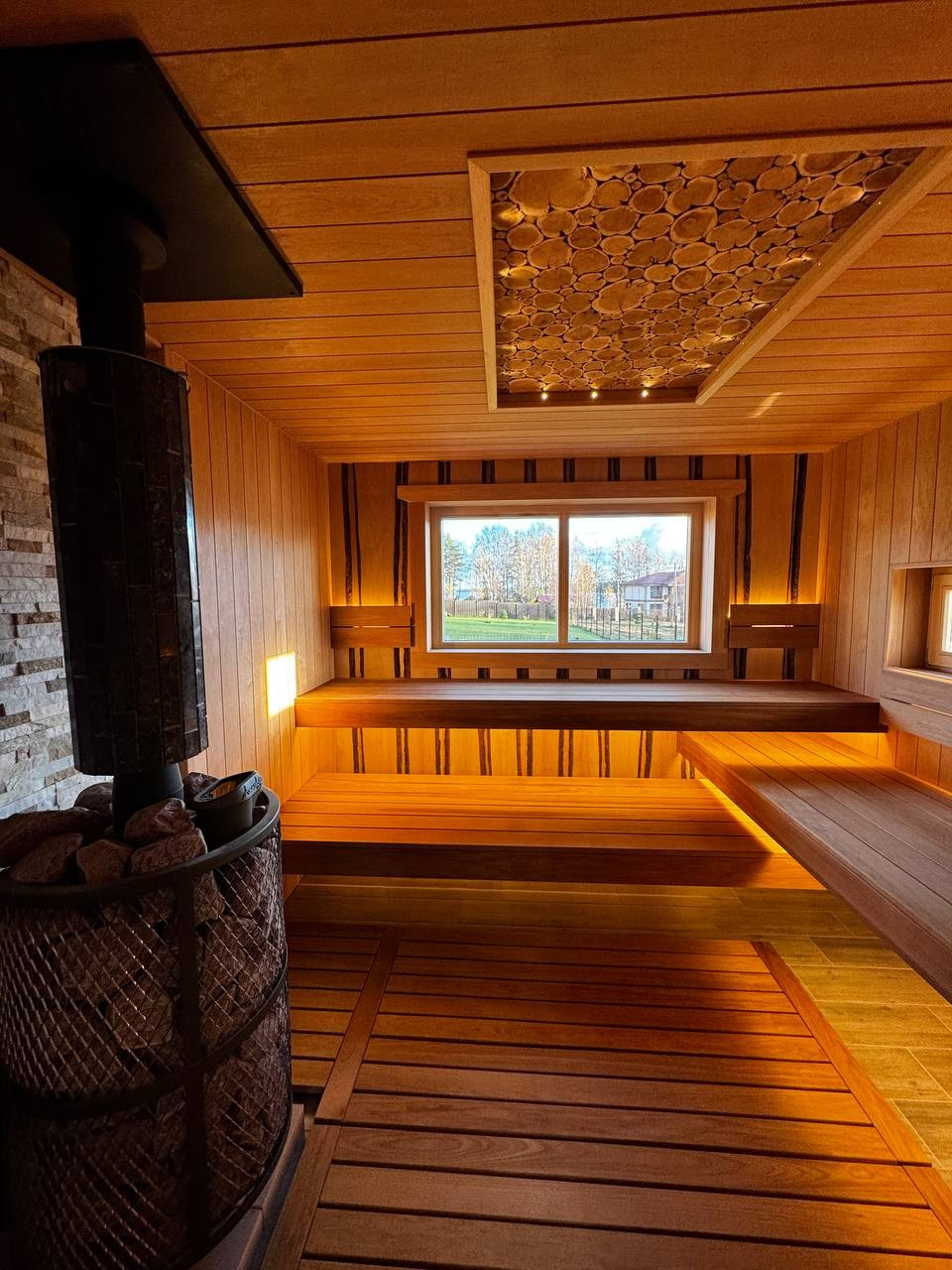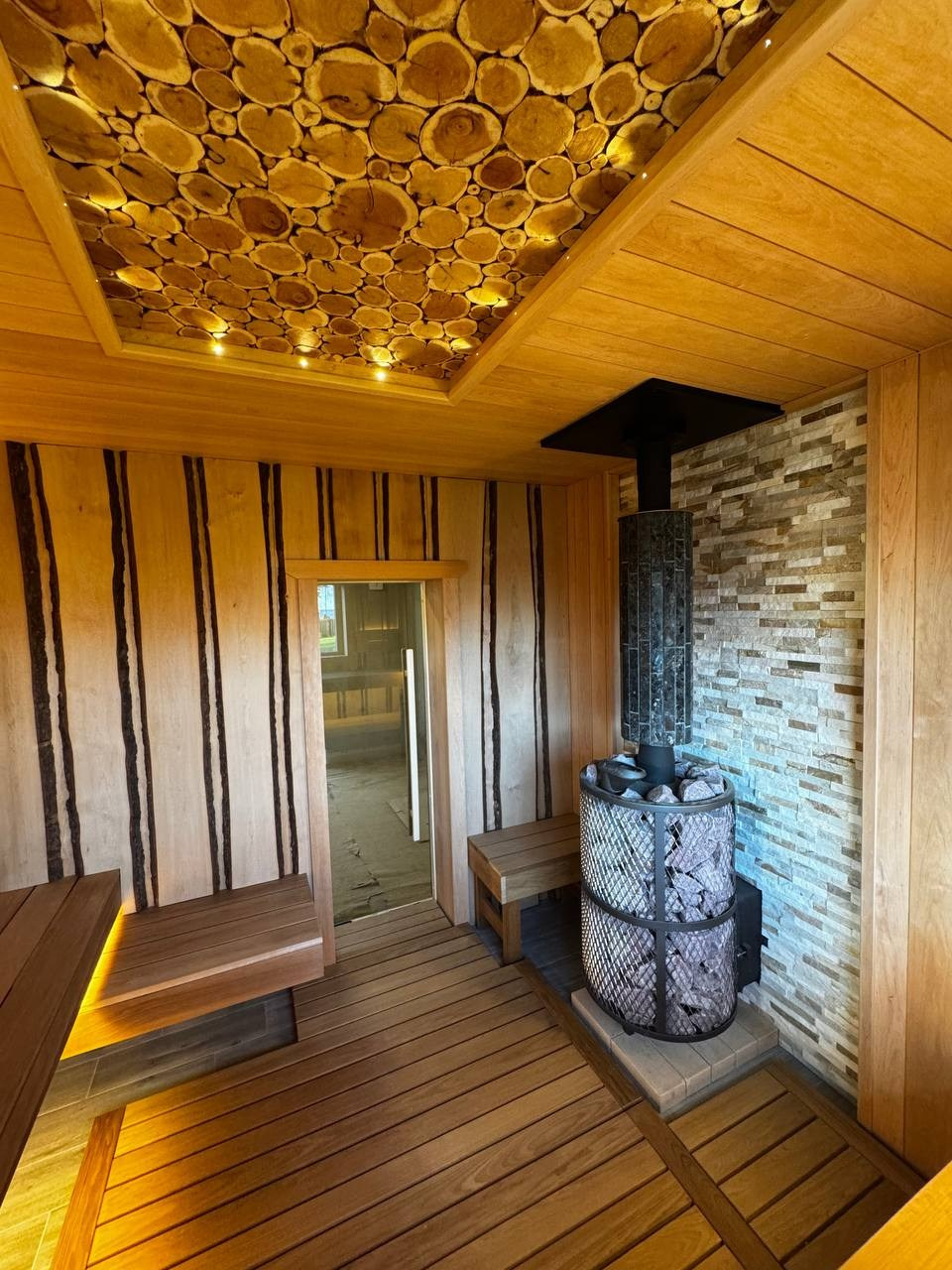 Получилась выразительная парная с природным характером. Сочетание ольхи и термоосины создаёт тёплый и гармоничный интерьер, а слэбы с корой добавляют уникальный декоративный акцент.