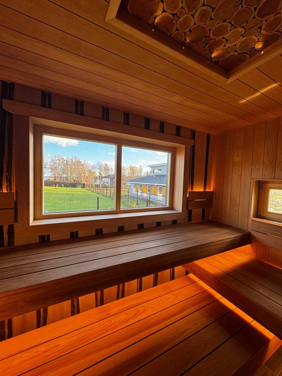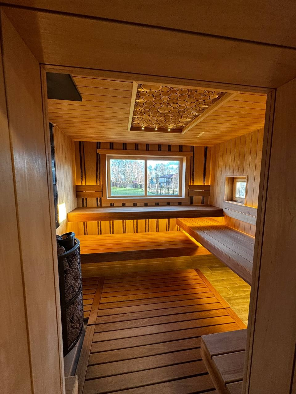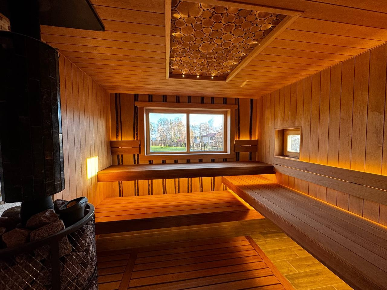 Интерьер этой сауны построен на сочетании тёплой древесины ольхи