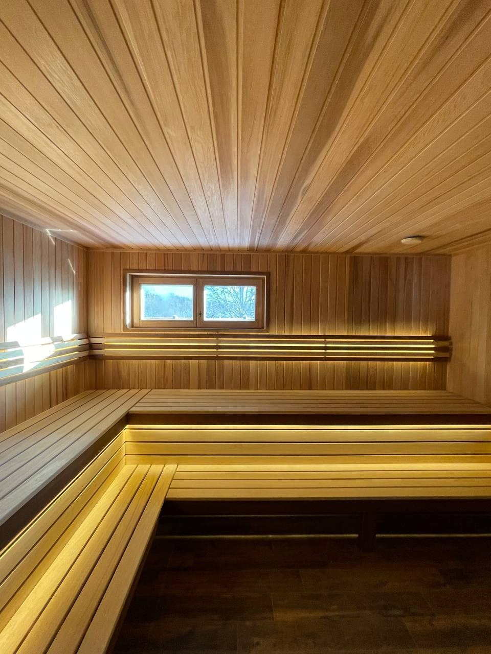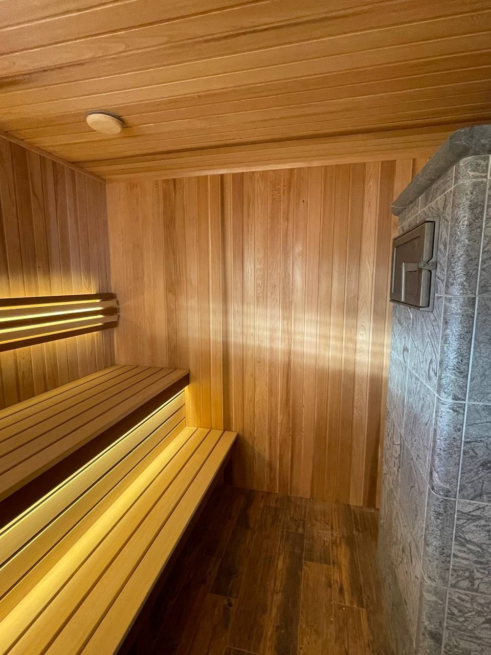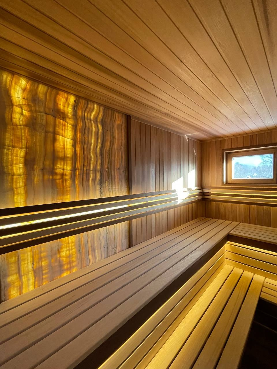 Стены и потолок полностью облицованы канадским кедром, благодаря чему интерьер выглядит цельным, тёплым и выразительным. Центральным декоративным элементом стало панно из цельного слэба оникса, которое добавляет пространству премиальный характер и становится визуальным акцентом парной.