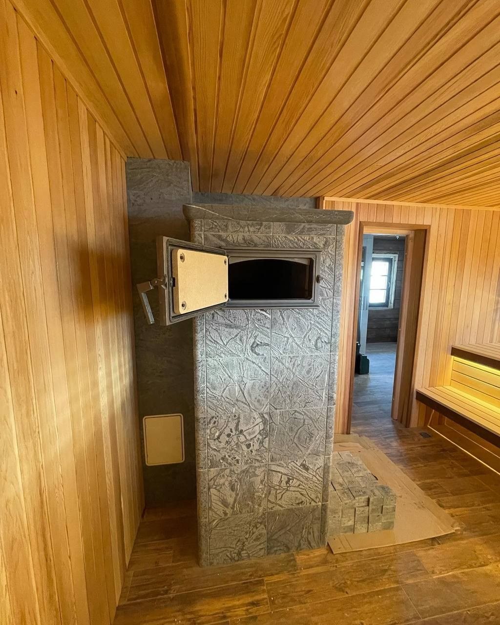 Канадский кедр формирует тёплую и ароматную атмосферу, слэб оникса становится выразительным дизайнерским акцентом, а печь Tulikivi Grinion обеспечивает мягкий и стабильный прогрев парной.