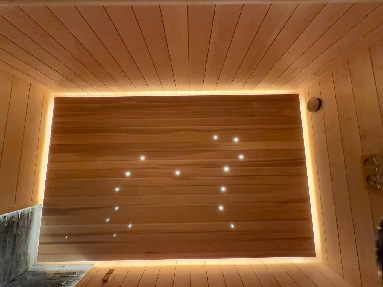 Ольха формирует спокойный интерьер, полки из абаша обеспечивают комфорт во время отдыха, а система звёздного неба и контурная подсветка создают атмосферу расслабления. Печь Mondex RAKKA встроена в конструкцию полка и гармонично вписывается в пространство парной.