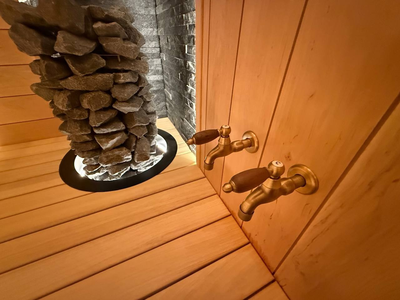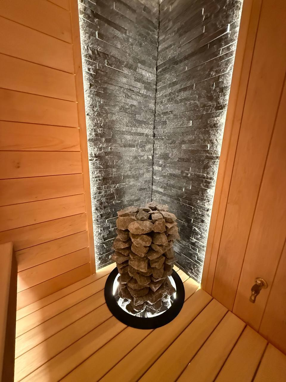 В центре парной установлена печь Mondex RAKKA мощностью 9 кВт, встроенная в конструкцию полка. Такое решение обеспечивает аккуратную эргономику пространства и исключает перегрев окружающих элементов.
