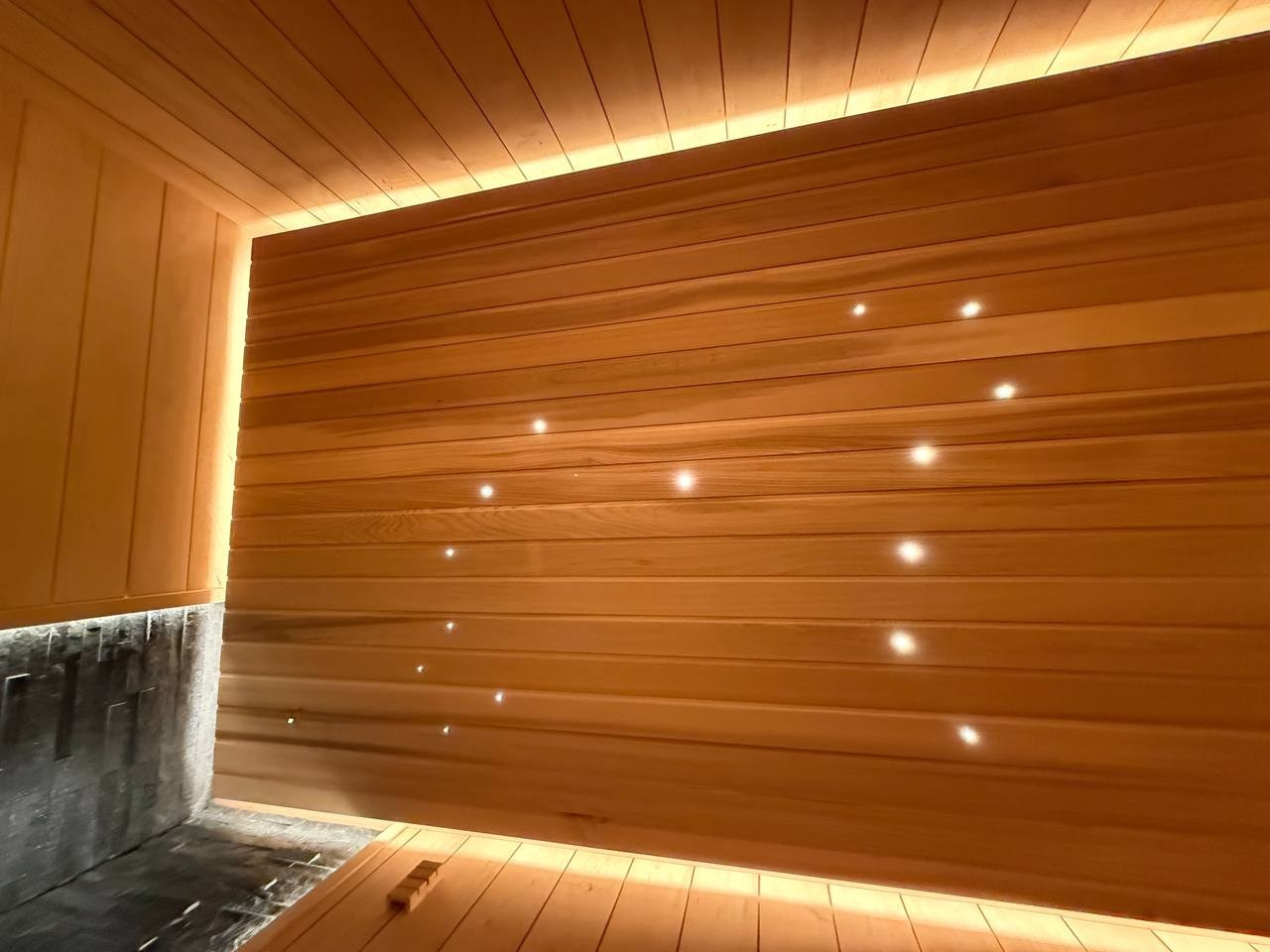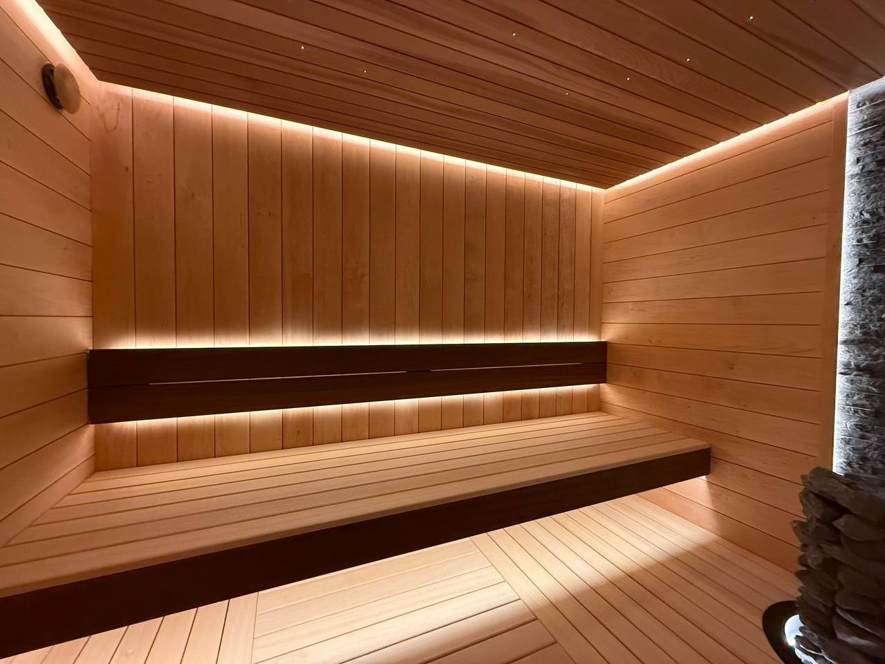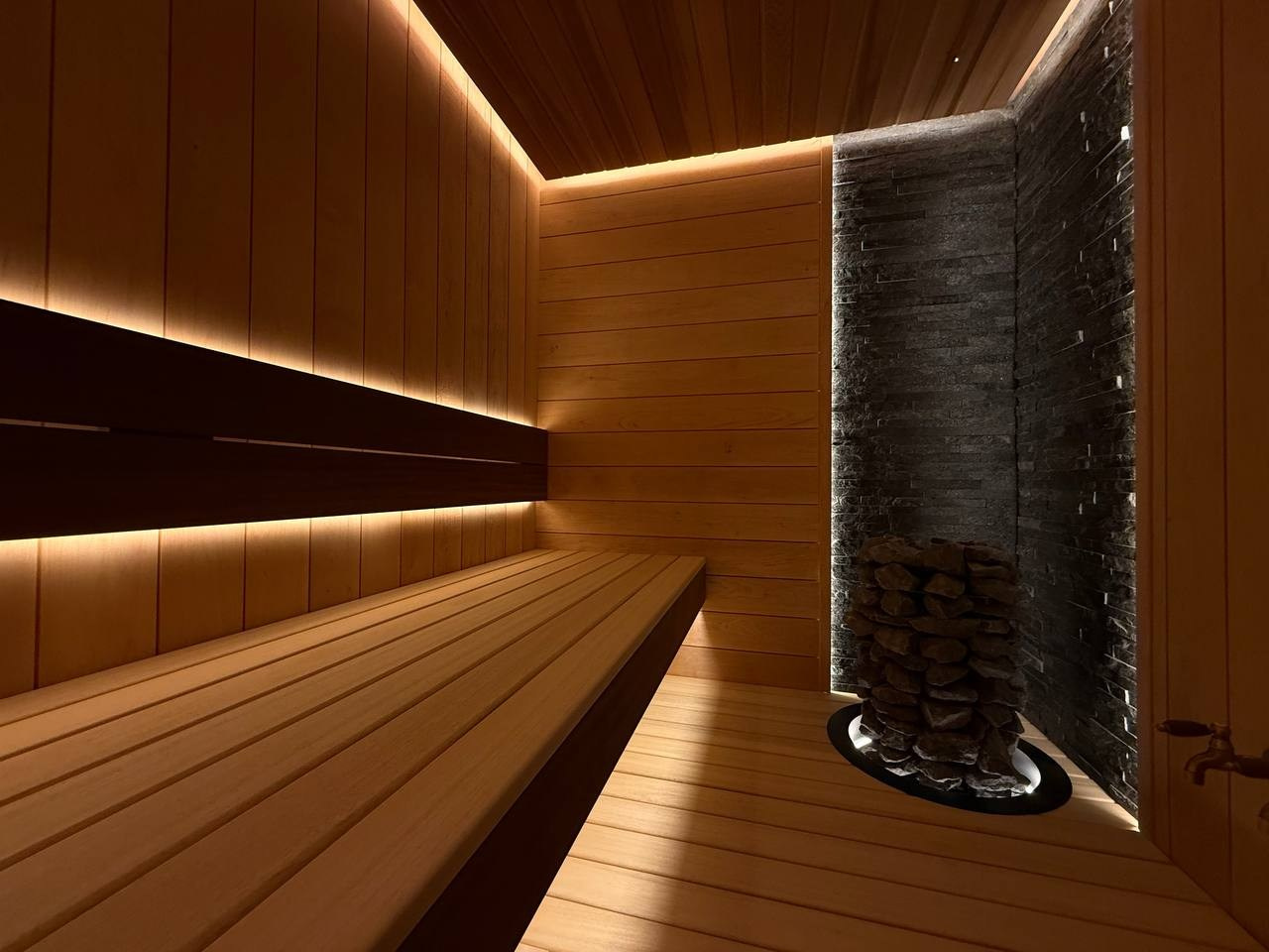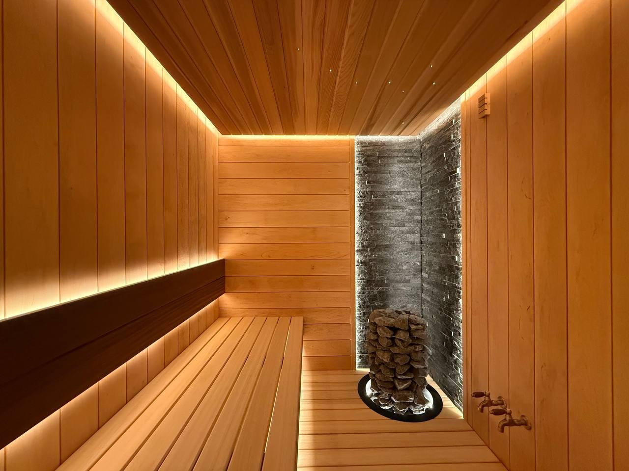 Этот проект сауны выполнен с акцентом на долговечность конструкции, продуманную эргономику и атмосферное освещение.