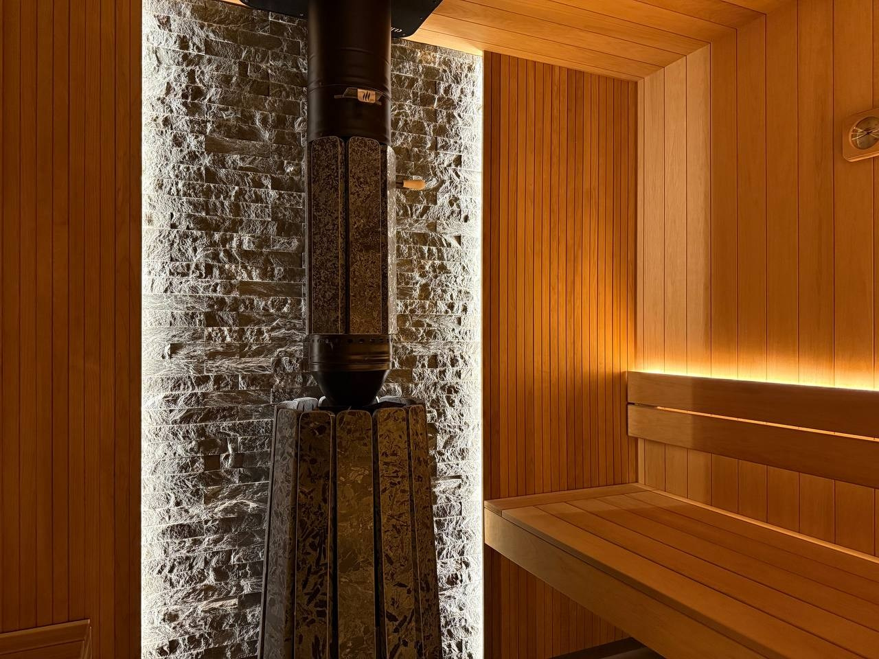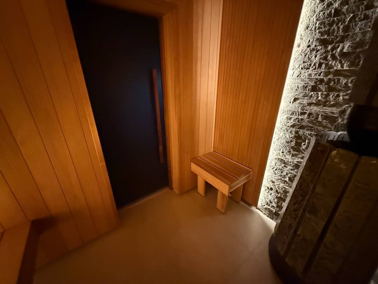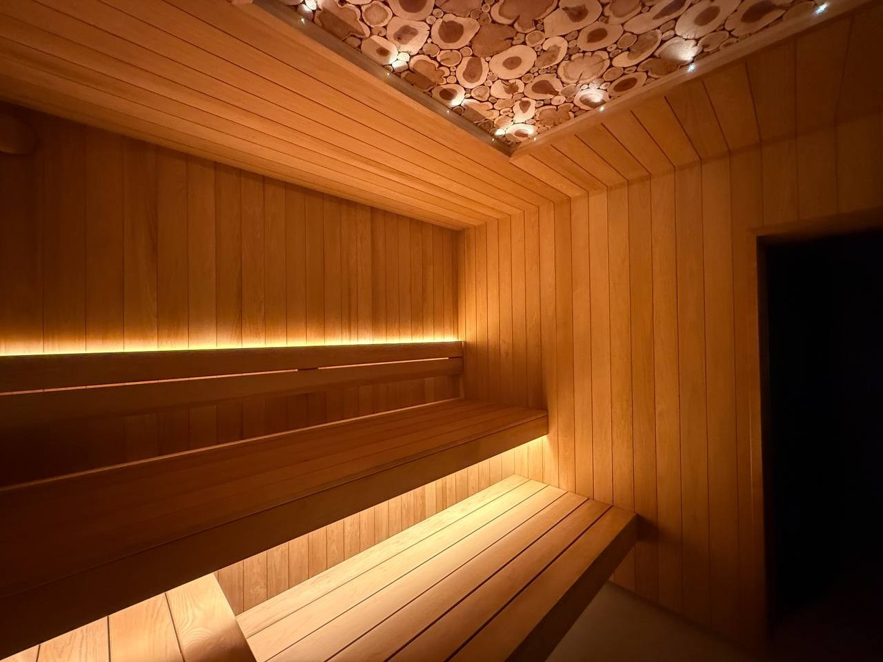 Этот проект сауны выполнен с акцентом на надёжность конструкции и аккуратную внутреннюю отделку. Основным материалом стала термоосина, которая хорошо переносит высокую температуру и влажность, оставаясь стабильной и долговечной.