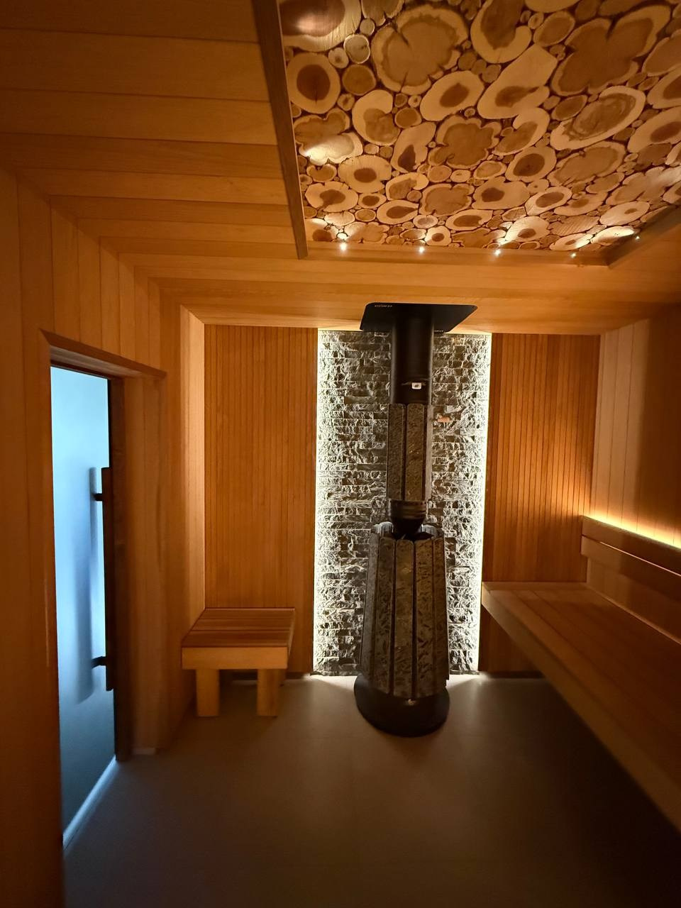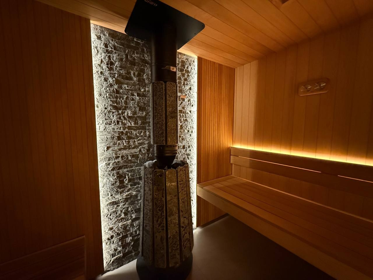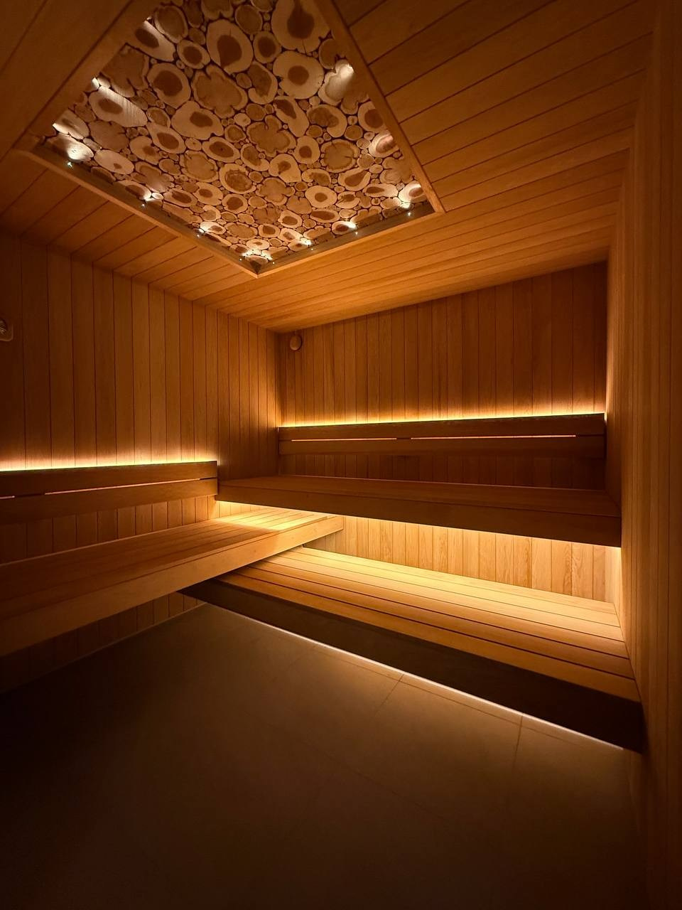 Этот проект сауны выполнен с акцентом на надёжность конструкции и аккуратную внутреннюю отделку. Основным материалом стала термоосина, которая хорошо переносит высокую температуру и влажность, оставаясь стабильной и долговечной.