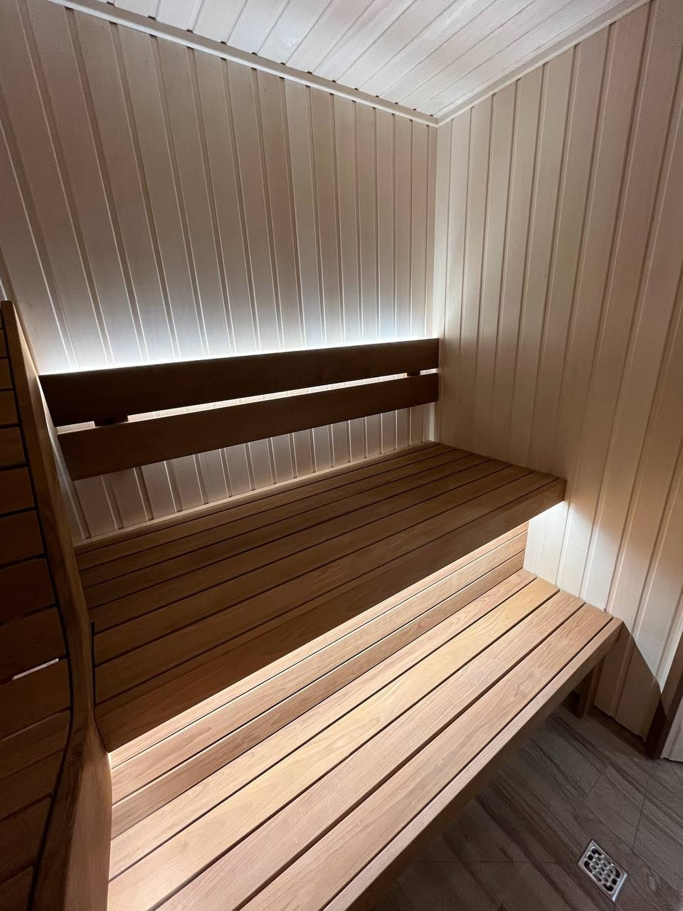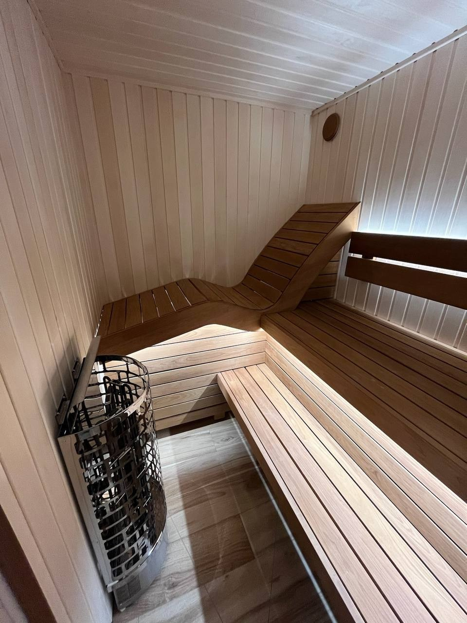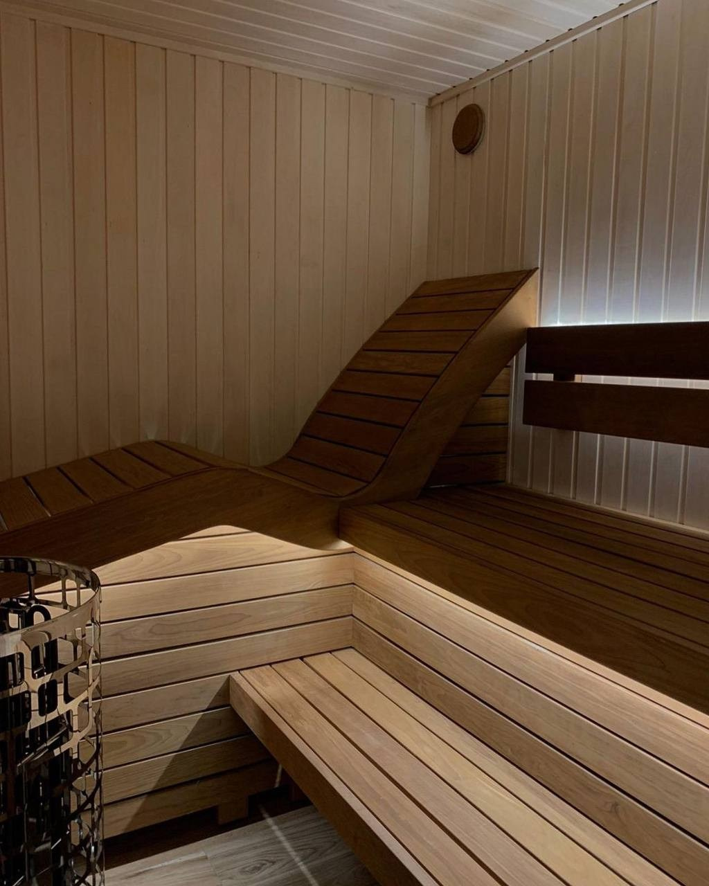 Стены выполнены из липы — светлой древесины, которая хорошо переносит высокую температуру и создаёт спокойную атмосферу внутри парной.