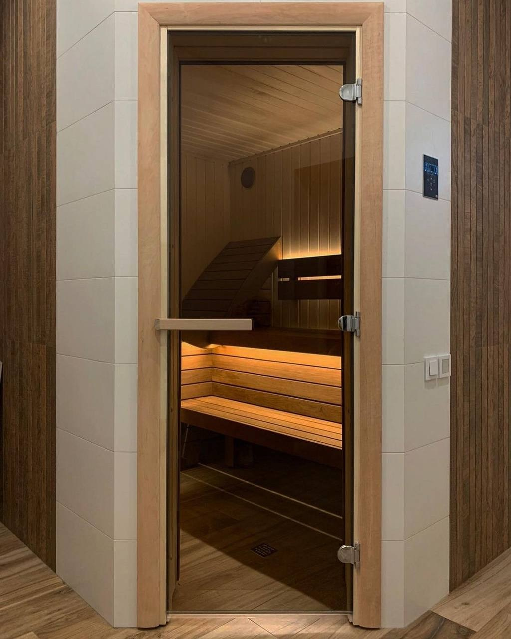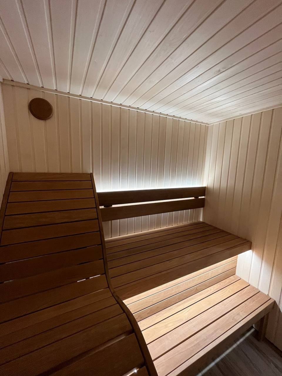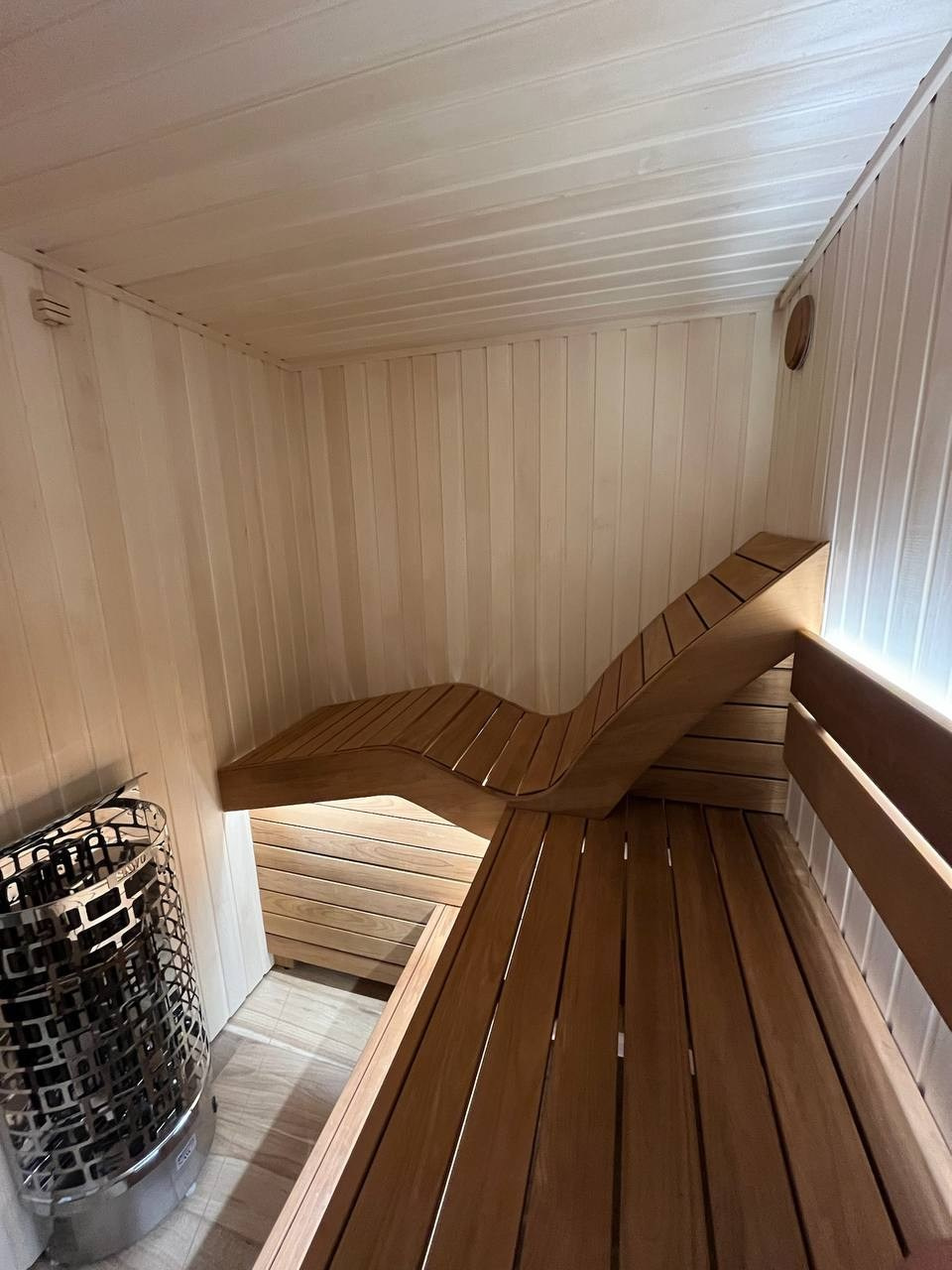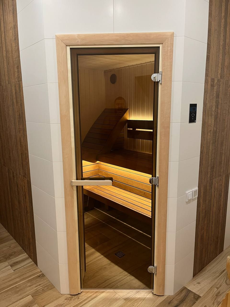 Стены выполнены из липы — светлой древесины, которая хорошо переносит высокую температуру и создаёт спокойную атмосферу внутри парной.