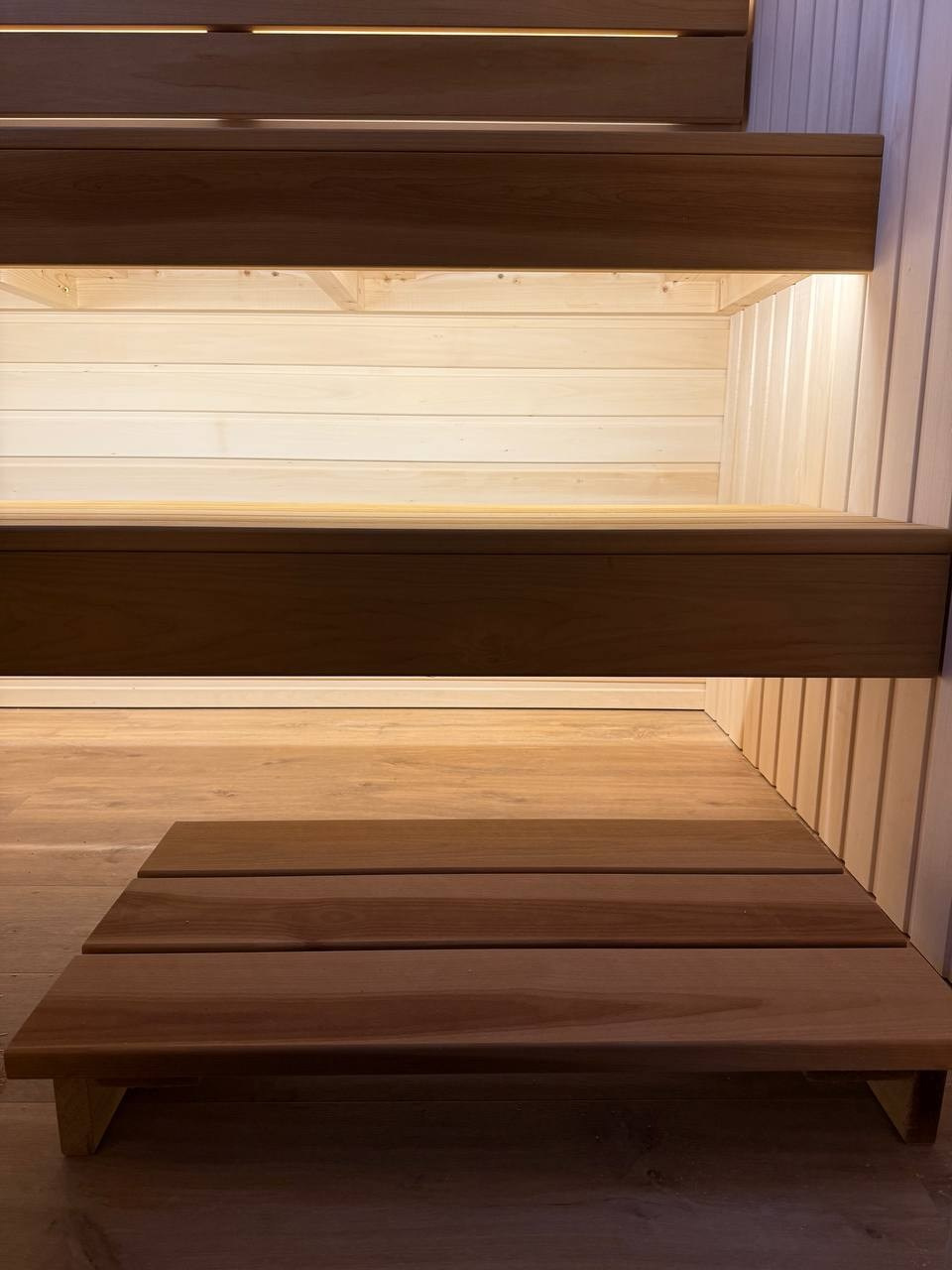 Полки изготовлены из термоосины шириной 85 мм. После термообработки древесина становится более устойчивой к влаге и температуре, а поверхность остаётся комфортной даже при высокой температуре.