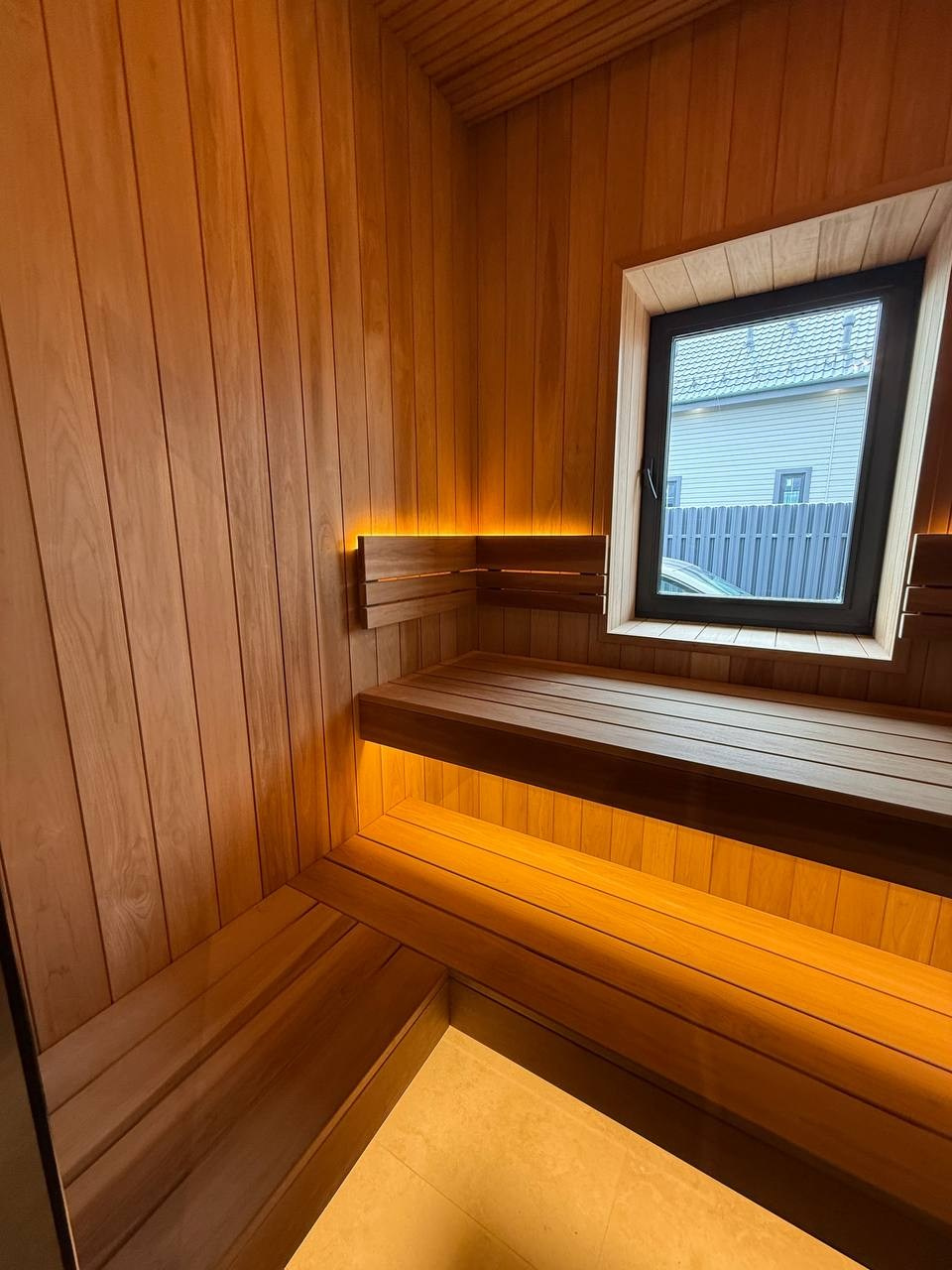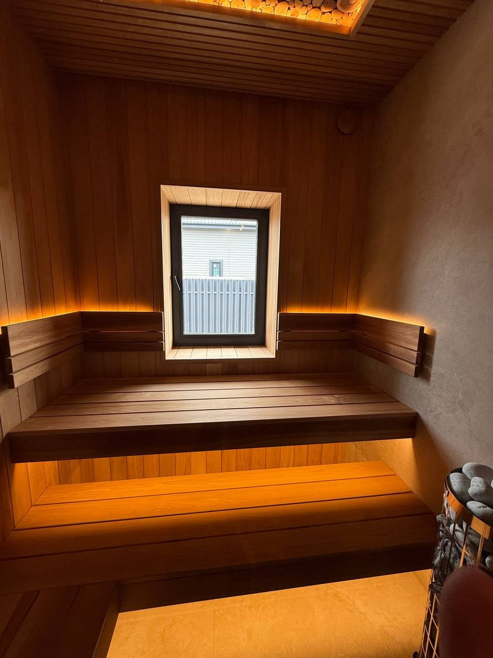 Современная сауна с контрастным сочетанием экзотической древесины и термообработанных пород.