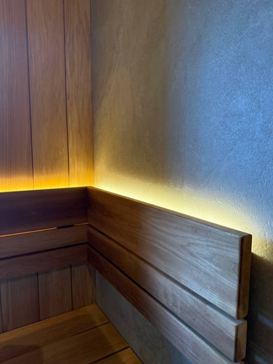 Современный интерьер сауны с выразительными древесными оттенками и точной инженерией.