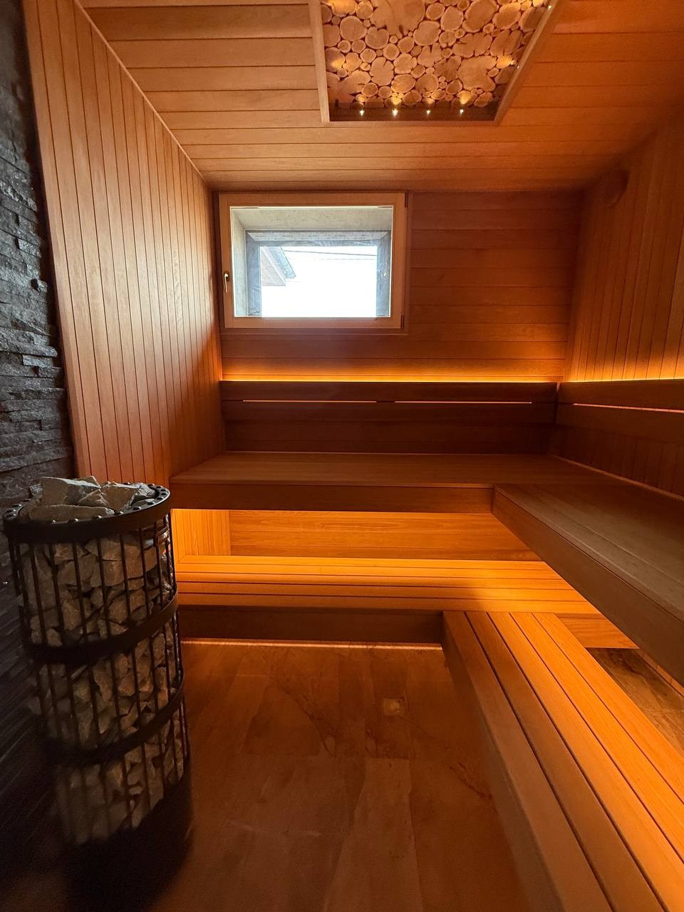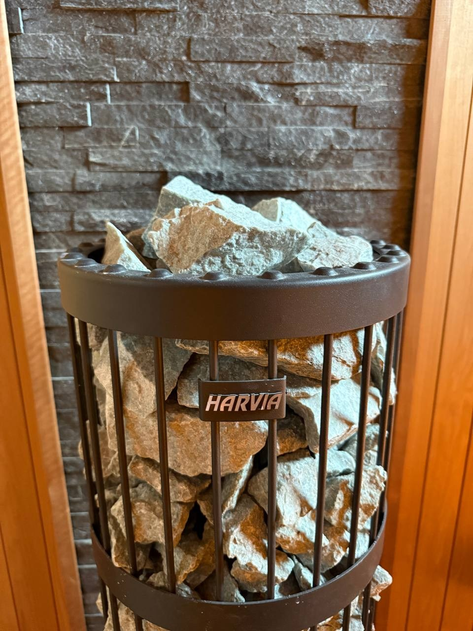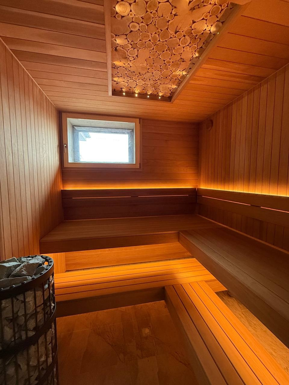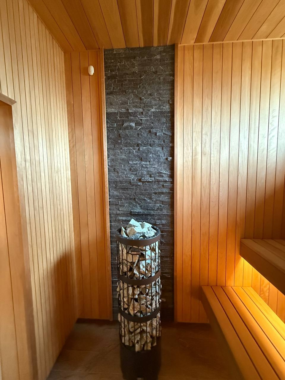 Сердцем парной стала печь Harvia Legend мощностью 11 кВт. Это один из немногих вариантов на рынке, где блок мощности встроен в печь, а управление осуществляется через выносной пульт. Такое решение особенно удобно для больших саун, где нет отдельного технического помещения.
