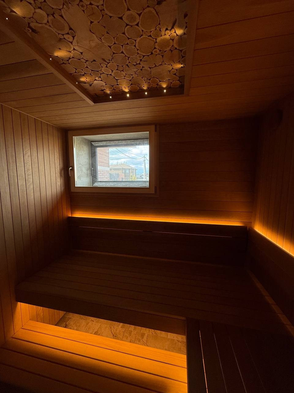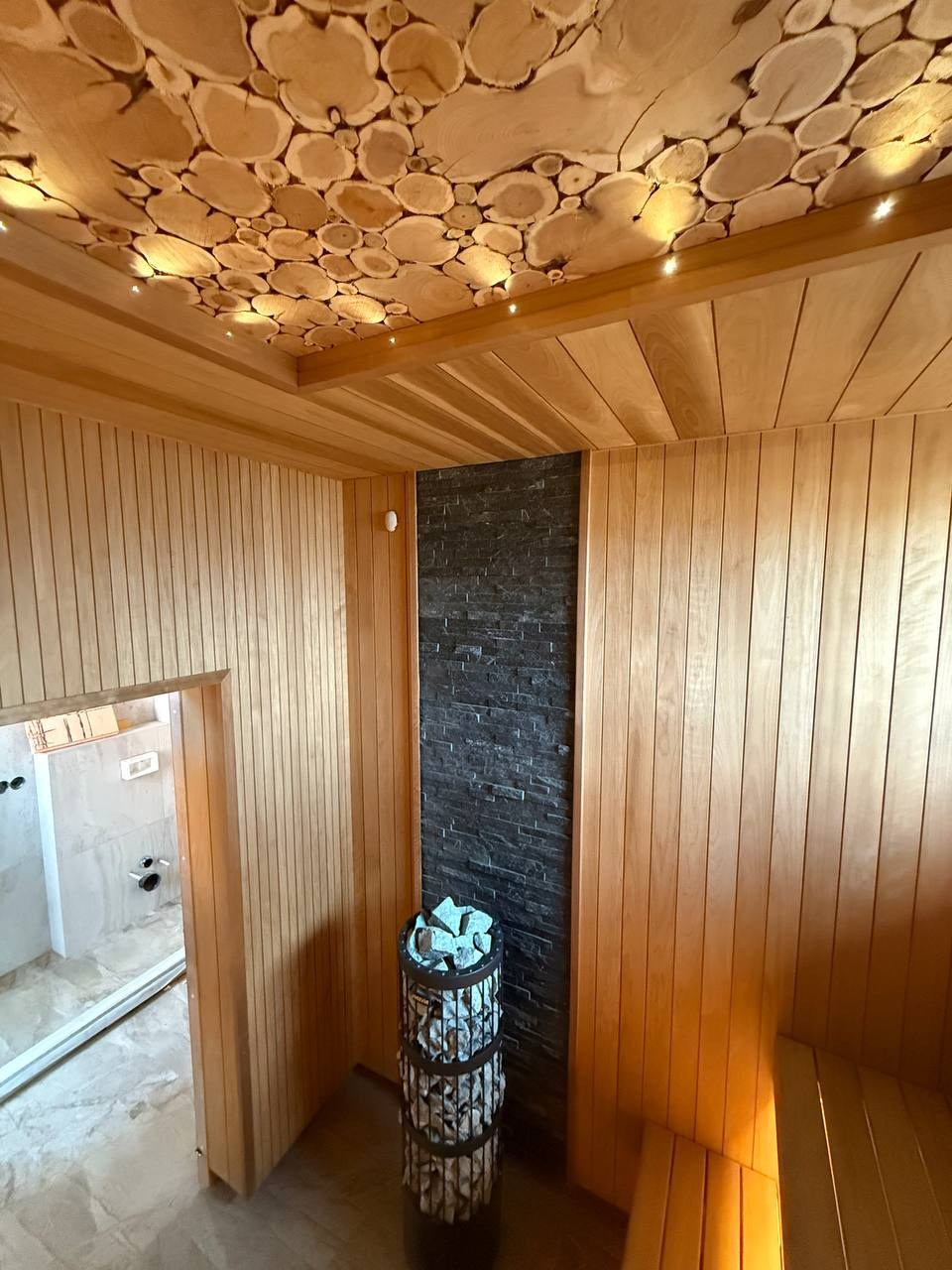 Получилась современная и выразительная сауна с натуральной отделкой из термоосины.