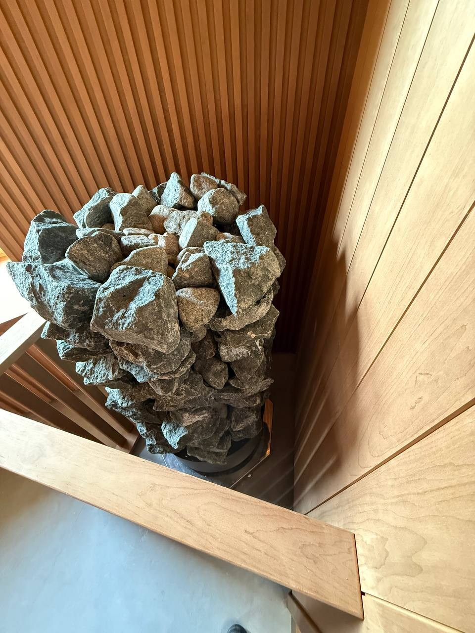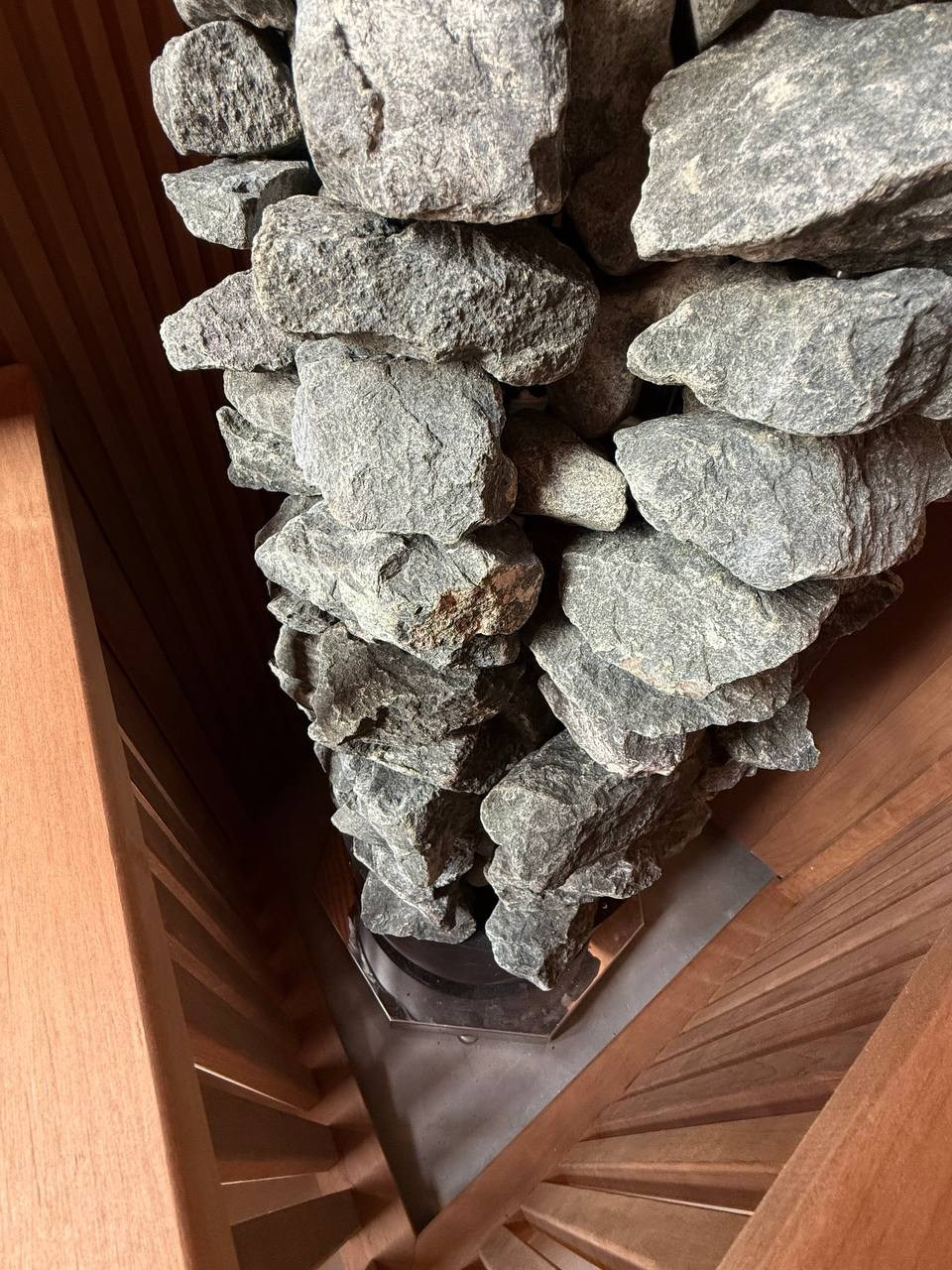 Главным акцентом интерьера стала печь Born Rock мощностью 12 кВт с выносным пультом управления. Конструкция печи собирается вручную из отдельных элементов и визуально напоминает каменную скалу, благодаря чему она становится центральным элементом интерьера парной.