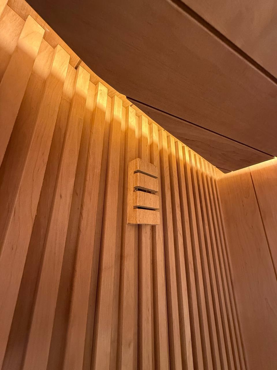 Отделка выполнена из термоольхи — стабильной термодревесины, устойчивой к высокой температуре и влажности. В проекте использовано несколько вариантов отделки: три вида вагонки, четыре вида доски и декоративная деревянная рейка, что добавляет интерьеру глубину и выразительность.
