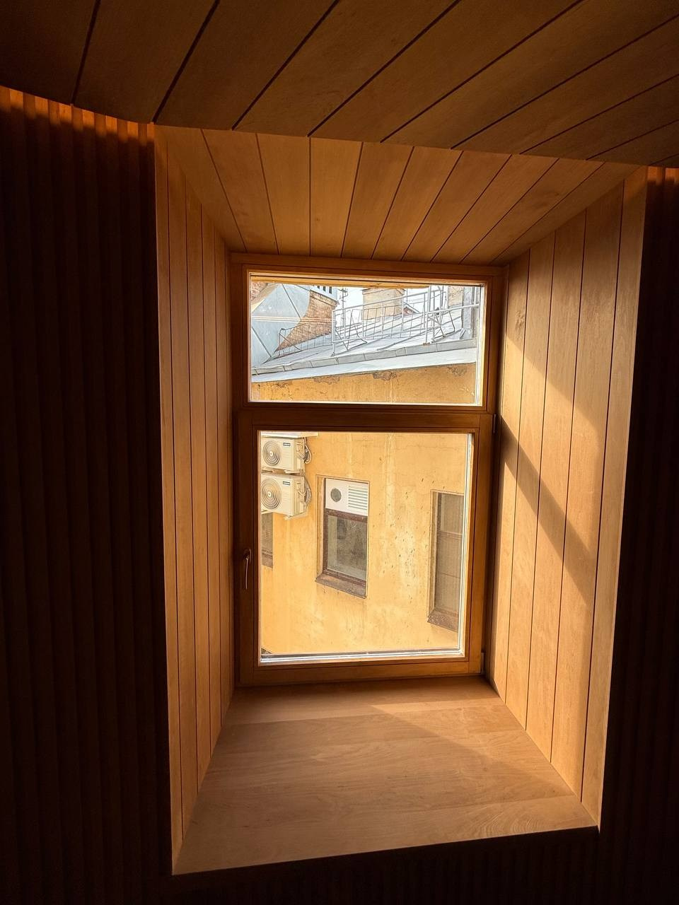 Этот проект частной сауны реализован в жилом доме в центре города, рядом с площадью Восстания. Парная расположена на пятом этаже и имеет площадь 14 м², что позволило создать комфортную и просторную планировку.